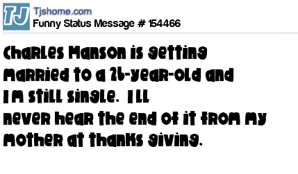 - # 154368 if you're sad about being single, especially with Christmas around the corner, just remember even Charles Manson found someone to marry him. So there's hope for you yet! Have a good day everybody!!