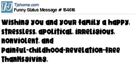 X says Wishing you and your family a happy, stressless, apolitical, irreligious, nonviolent, and painful-childhood-revelation-free Thanksgiving.