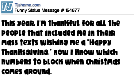 X says This year, I'm thankful for all the people that included me in their mass texts wishing me a "Happy Thanksgiving," now I know which numbers to block when Christmas comes around.
