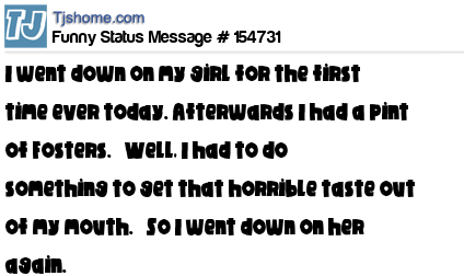 X says I went down on my girl for the first time ever today. Afterwards I had a pint of Fosters. Well, I had to do something to get that horrible taste out of my mouth. So I went down on her again.