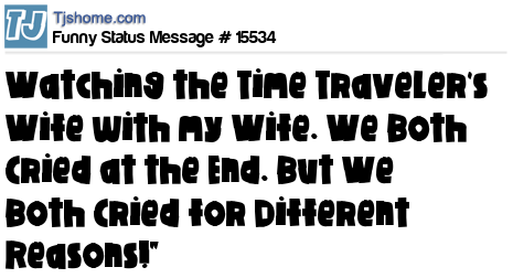 X is watching the Time Traveler's Wife with my Wife. We Both Cried at the End. But We Both Cried for Different Reasons!"