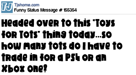 X says Headed over to this "Toys for Tots" thing today...so how many tots do I have to trade in for a PS4 or an Xbox One?