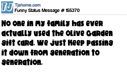 X No one in my family has ever actually used the Olive Garden gift card. We just keep passing it down from generation to generation.