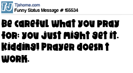 X says Be careful what you pray for: you just might get it. Kidding! Prayer doesn’t work.