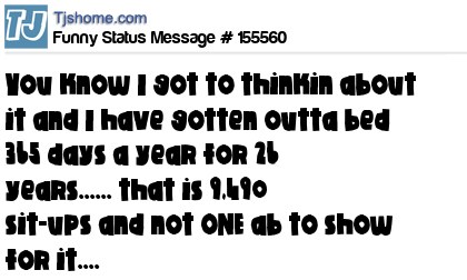 X You know I got to thinkin about it and I have gotten outta bed 365 days a year for 26 years...... that is 9,490 sit-ups and not ONE ab to show for it....