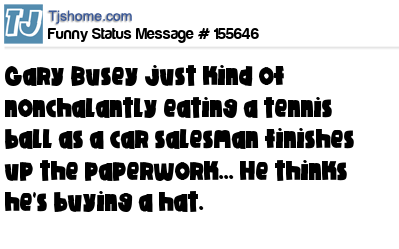 X Gary Busey just kind of nonchalantly eating a tennis ball as a car salesman finishes up the paperwork... He thinks he's buying a hat.