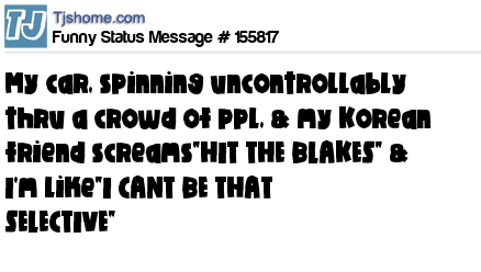 X says My car, spinning uncontrollably thru a crowd of ppl, & my Korean friend screams"HIT THE BLAKES" & I'm like"I CANT BE THAT SELECTIVE"