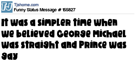 - # 155836 I remember simpler times, when George Michael was straight, Prince was gay, and Catholic Priests could be trusted with young boys.