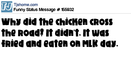 X says Why did the chicken cross the road? It didn't. It was fried and eaten on MLK day.