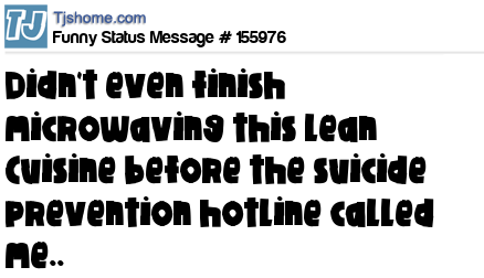 X says Didn't even finish microwaving this Lean Cuisine before the suicide prevention hotline called me..