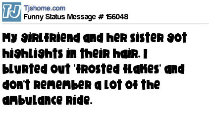 X says My girlfriend and her sister got highlights in their hair. I blurted out 'frosted flakes' and don't remember a lot of the ambulance ride.
