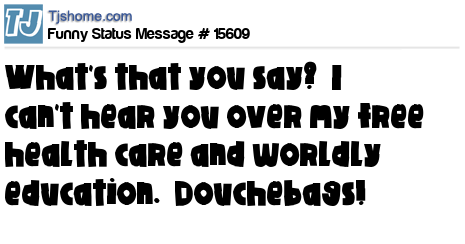 X is What's that you say? I can't hear you over my free health care and worldly education. Douchebags!