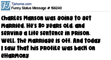 - # 154466 Charles Manson is getting married to a 26-year-old and I’m still single. I’ll never hear the end of it from my mother at thanks giving.