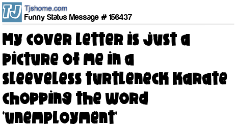 - # 151199 My cover letter is just a picture of me in a sleeveless turtleneck karate chopping the word 'unemployment'.
