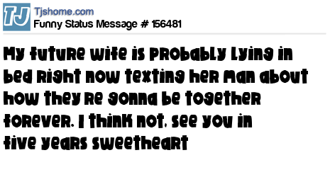 - # 163356 My future wife is probably lying in bed right now texting her man about how they’re gonna be together forever. I think not, see you in two years babe