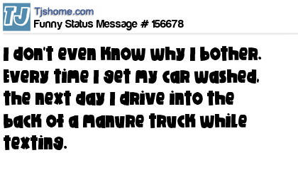 X says I don't even know why I bother. Every time I get my car washed, the next day I drive into the back of a manure truck while texting.