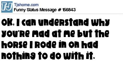 - # 198724 OK, I can understand why you're mad at me, but the horse I rode in on had nothing to do with it.