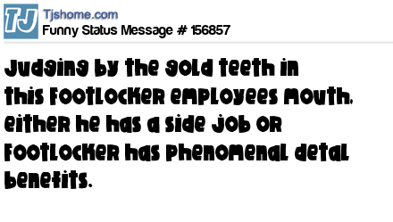 X says Judging by the gold teeth in this Footlocker employees mouth, either he has a side job or Footlocker has phenomenal detal benefits.