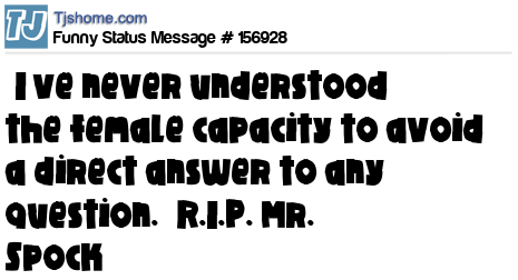 X says “I’ve never understood the female capacity to avoid a direct answer to any question.” R.I.P. Mr. Spock