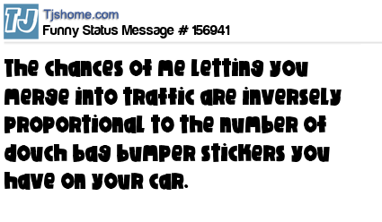 X says The chances of me letting you merge into traffic are inversely proportional to the number of douch bag bumper stickers you have on your car.