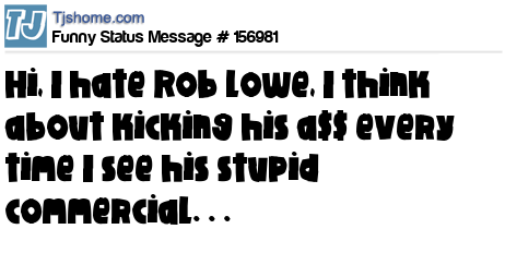 X says Hi, I hate Rob Lowe, I think about kicking his a$$ every time I see his stupid commercial. . .