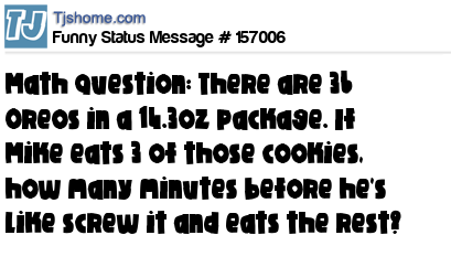 X says Math question: There are 36 Oreos in a 14.3oz package. If Mike eats 3 of those cookies, how many minutes before he's like screw it and eats the rest?