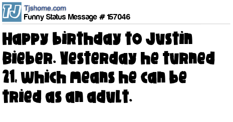 X says Happy birthday to Justin Bieber. Yesterday he turned 21, which means he can be tried as an adult.