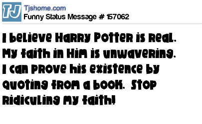 X says I believe Harry Potter is real. My faith in Him is unwavering. I can prove his existence by quoting from a book. Stop ridiculing my faith!