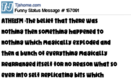 X says ATHEISM :The belief that there was nothing then something happened to nothing which magically exploded and then a bunch of everything magically rearranged itself for no reason what so ever into self replicating bits which gained conciousness to debate it.
