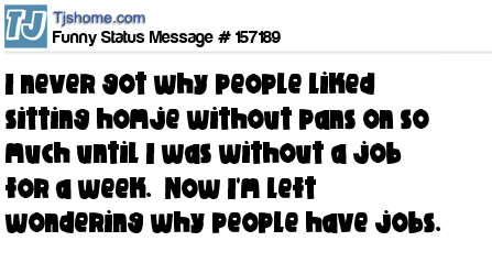 X says I never got why people liked sitting homje without pans on so much until I was without a job for a week.  Now I'm left wondering why people have jobs.