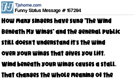 X says How many singers have sung "The Wind Beneath My Wings" and the general public still doesn't understand it's the wind over your wings that gives you lift. Wind beneath your wings causes a stall. That changes the whole meaning of the song!