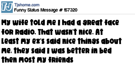 X My wife told me I had a great face for radio. That wasn't nice. At least my ex's said nice things about me, they said I was better in bed then most my friends