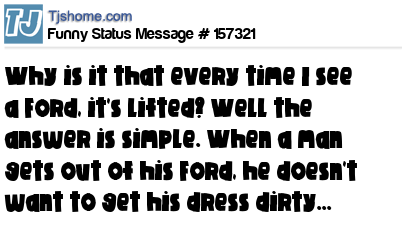 X Why is it that every time I see a Ford, it's lifted? Well the answer is simple. When a man gets out of his Ford, he doesn't want to get his dress dirty...