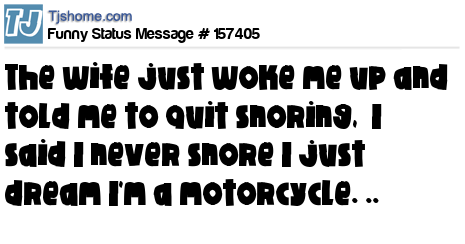 X says the wife just woke me up and told me to quit snoring, I said I never snore I just dream I'm a motorcycle. ..