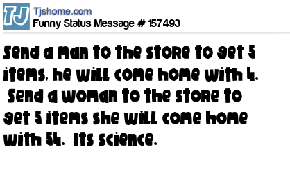 X says Send a man to the store to get 5 items, he will come home with 4. Send a woman to the store to get 5 items she will come home with 54. Its science.