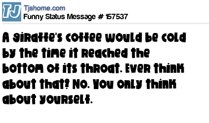 - # 163689 A giraffe's coffee would be cold by the time it hit the bottom of his throat. Ever think about that? No, you only think about yourself.