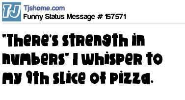 X says "There's strength in numbers" I whisper to my 9th slice of pizza.