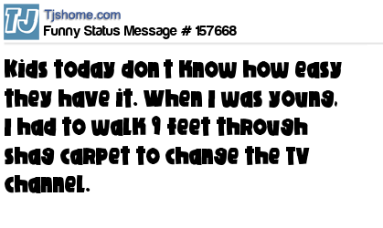 - # 157690 Kids today don’t know how easy they have it. When I was young, I had to walk 9 feet through shag carpet to change the TV channel by using a dial.