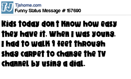 - # 157668 Kids today don’t know how easy they have it. When I was young, I had to walk 9 feet through shag carpet to change the TV channel.