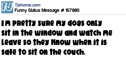 X says I’m pretty sure my dogs only sit in the window and watch me leave so they know when it is safe to sit on the couch.