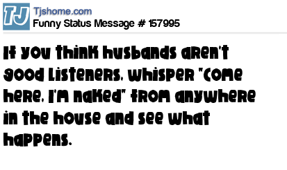 X says If you think husbands aren't good listeners, whisper "Come here, I'm naked" from anywhere in the house and see what happens.
