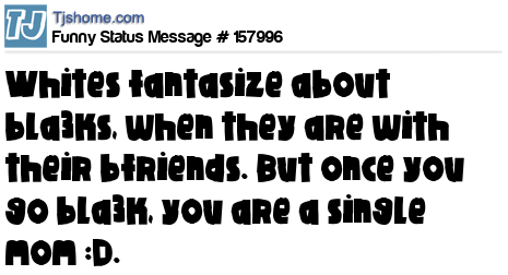 X says Whites fantasize about bla3ks, when they are with their bfriends. But once you go bla3k, you are a single mom :D.