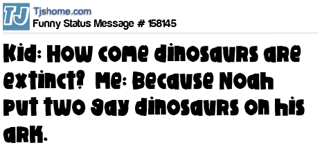 X says Kid: How come dinosaurs are extinct? Me: Because Noah put two gay dinosaurs on his ark.