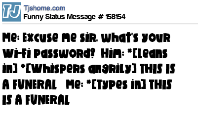 X says Me: Excuse me sir, what's your Wi-Fi password? Him: *[Leans in] *[Whispers angrily] THIS IS A FUNERAL Me: *[Types in] THIS IS A FUNERAL