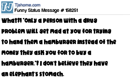 X What?! "Only a person with a drug problem will get mad at you for trying to hand them a hamburger instead of the money they ask you for to buy a hamburger."? I don't believe they have an elephant's stomach.