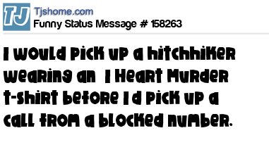 - # 155285 I would pick up a hitchhiker wearing an "I Heart Murder" t-shirt before I'd pick up a call from a blocked number.