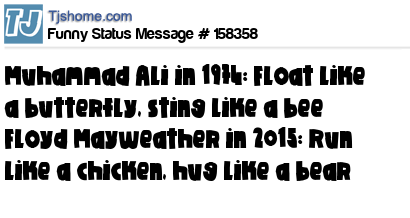 X says Muhammad Ali in 1974: Float like a butterfly, sting like a bee  Floyd Mayweather in 2015: Run like a chicken, hug like a bear