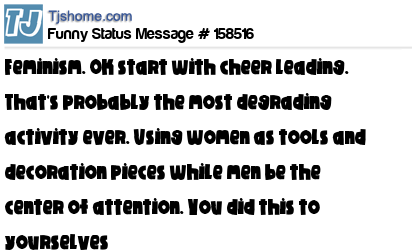 X says Feminism. Ok start with cheer leading. That's probably the most degrading activity ever. Using women as tools and decoration pieces while men be the center of attention. You did this to yourselves