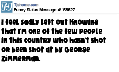 X says I feel sadly left out knowing that I'm one of the few people in this country who hasn't shot or been shot at by George Zimmerman.