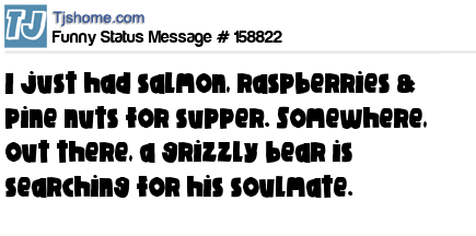 X says I just had salmon, raspberries & pine nuts for supper. Somewhere, out there, a grizzly bear is searching for his soulmate.